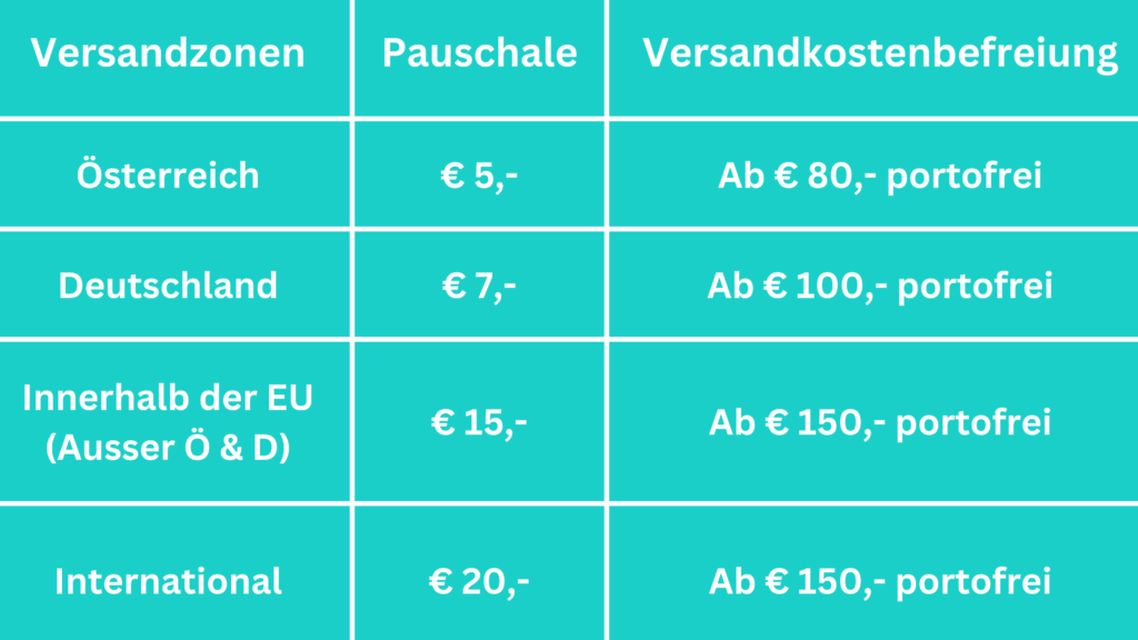 Zusätzlich zu den angegebenen Preisen berechnen wir für die Lieferung pauschale Kosten, die der nachstehenden Tabelle zu entnehmen sind.